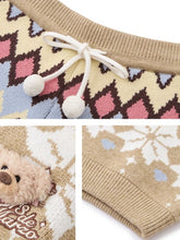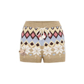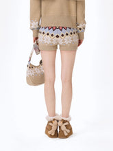 A pair of slim-fit knit shorts featuring a winter-inspired snowflake contrast pattern. Designed for a flattering silhouette with cozy seasonal texture, these shorts blend comfort with a stylish autumn–winter aesthetic, perfect for casual layering or coordinated knit outfits.