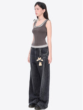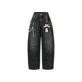 A women’s statement denim piece from the 13 DE MARZO 2026 Early Spring collection, designed with faux crystal and beaded chain embellishments for a bold yet refined vintage appeal. Crafted in a relaxed, wide curved-leg silhouette, these jeans channel retro workwear influences while maintaining a modern fashion-forward attitude. The loose fit enhances comfort and movement, making them an eye-catching option for elevated everyday styling.
