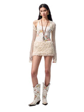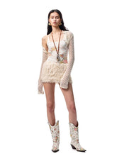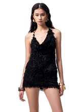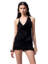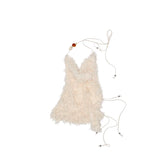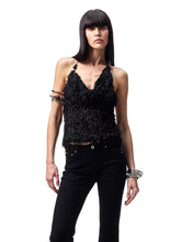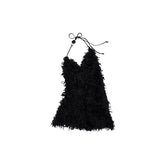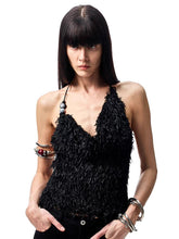 An elegant two-piece set featuring a beaded feather-effect halter top paired with a fitted midi skirt. Designed with an asymmetric draped cowl neckline and a bold open-back halter silhouette, it highlights the back with a refined, sensual appeal. The waist tie detail allows for adjustable fitting based on individual body shape. Contrasting beaded embellishments on the halter straps add a delicate yet eye-catching accent. Crafted from a custom feather-effect fabric, the set feels lightweight, airy, soft, and skin-friendly, creating a relaxed yet sophisticated mood.