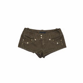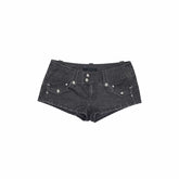 These vintage-inspired micro shorts feature a rugged utility denim canvas design with a distressed, worn-in finish for a bold streetwear look. Cut with a low-rise waist and a slim, body-hugging silhouette, they accentuate the waist and legs while maintaining a sharp, structured profile. The ultra-short length enhances proportions and delivers a confident, edgy attitude. Ideal for summer styling, these shorts work well for casual wear, street outfits, or statement looks with a retro workwear influence.