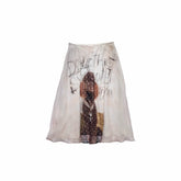 This elegant midi skirt features a double-layer chiffon construction with soft printed detailing, creating a subtly sheer, refined look. Designed in a relaxed A-line silhouette, it drapes effortlessly to enhance movement while maintaining a flattering, airy shape. The lightweight fabric delivers an elevated, feminine atmosphere, making it ideal for everyday wear, date styling, or graceful layering with knits and blouses. Balanced between comfort and elegance, this skirt offers timeless versatility with modern charm.