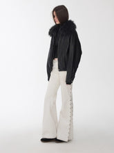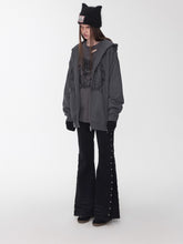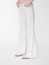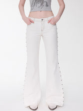 These mid-low rise flared jeans combine a relaxed silhouette with structured tailoring for a flattering leg shape. The open-flare hemline elongates the legs, while the side seams are embellished with customized semi-round metal studs for a sleek, edgy finish. Designed for easy everyday styling, the jeans bring both attitude and comfort to your wardrobe.