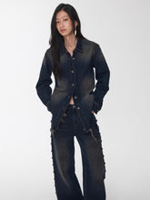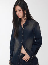 This structured denim shirt features a classic straight-shoulder tailored silhouette that flatters the figure while maintaining a clean, sharp shape. The curved hemline and distressed frayed edges create a relaxed yet polished look. Crafted from premium non-stretch diagonal cotton denim with a dense weave and crisp texture, it naturally holds its shape when worn. The heavy washed finish enhances the fabric’s depth, resulting in a unique blue-black tone with a soft vintage fade. Combined with distressed fraying details, this piece delivers a refined, high-quality feel full of nostalgic charm and casual sophistication.