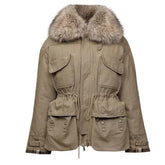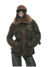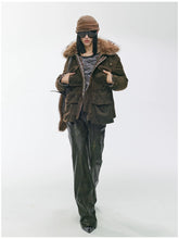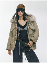 A statement-making utility down jacket crafted with bold detailing and a distressed, washed finish. Designed with a detachable faux-fur collar, patchwork plaid panels, and multi-pocket construction, this piece blends rugged workwear aesthetics with modern punk attitude. Stud accents and textural contrasts add depth, while the oversized silhouette delivers warmth, comfort, and effortless layering power—perfect for standout winter styling.