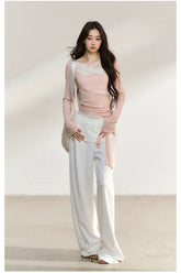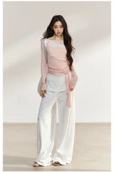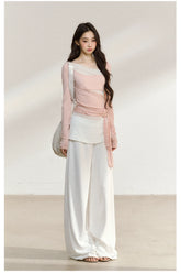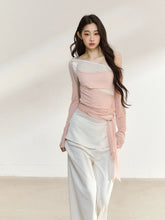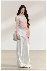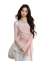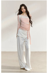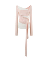 This stylish top features a faux two-piece design with a cinched waist silhouette that combines soft knit and sheer mesh fabrics. The subtle translucency and elastic comfort of the material create a flattering, breathable fit. The diagonal tie-cross design adds a dynamic sense of motion and structure, emphasizing the waistline and enhancing body proportions. The soft pink hue brings a feminine yet contemporary touch — ideal for chic seasonal styling.