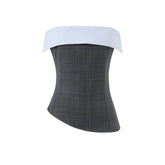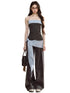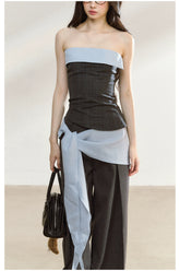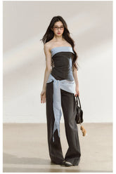 This contemporary two-piece set exudes refined allure with a bold, modern edge. The bandeau top features a contrasting color-blocked neckline that enhances visual depth and accentuates the waistline. The back’s elastic smocking design ensures flexibility and comfort, while the detachable belt detail on the trousers adds versatility for multiple styling options. Together, the set presents a confident yet elegant silhouette — perfect for creating a sleek “it-girl” look with an elevated touch.