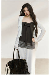 This Korean-inspired two-piece set exudes a relaxed, effortless charm. The outer sheer shirt is designed with a subtle ruffled edge, adding movement and a sense of layered depth. Paired with a soft inner camisole, it creates a lightweight and breathable silhouette perfect for transitional seasons. The versatile combination allows for styling together or separately, balancing femininity and casual sophistication.