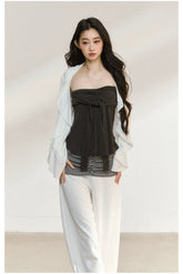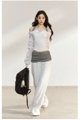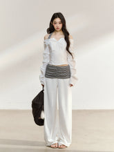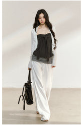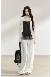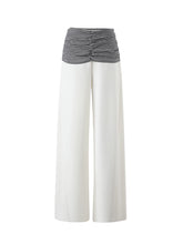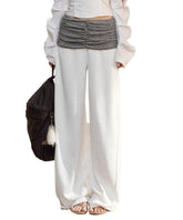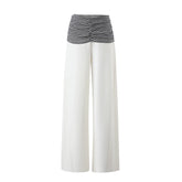These trousers feature a loose, straight-leg silhouette with a structured drape that flatters the figure while maintaining a relaxed, comfortable fit. The wide waistband with striped patchwork adds visual depth and a subtle layered texture, enhancing the overall sense of design. Effortlessly versatile and easy to style, this piece balances modern casualness with understated sophistication, perfect for both daily wear and elevated looks.