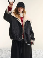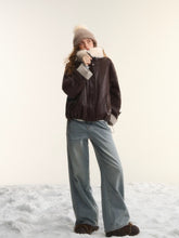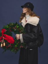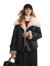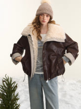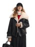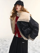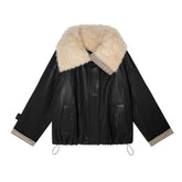 A statement short puffer jacket combining a sleek leather-look shell with checkered patchwork details and a plush faux-fur turn-down collar. The structured silhouette is warm, modern, and highly wearable, delivering a bold winter look with elevated texture contrast. Filled with premium 90% white duck down, this thickened style ensures excellent insulation while maintaining a stylish cropped proportion that flatters the figure.