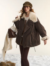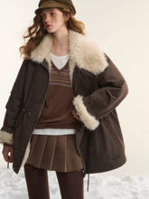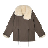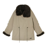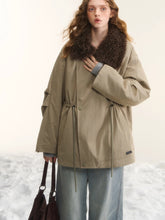 A cozy winter parka designed with a statement oversized faux-fur collar and a relaxed utility-inspired silhouette. Featuring an adjustable drawstring waist to shape the figure, this jacket balances warmth with structure for a flattering yet laid-back look. The fleece-lined, thickened construction ensures comfort in cold weather, while the workwear details add a casual, modern edge—perfect for everyday winter styling.