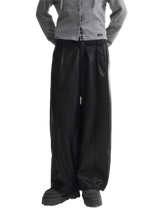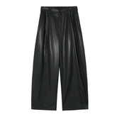 A retro-inspired pair of black PU pants designed with a curved-leg silhouette and strategic panelled seam lines to visually slim and elongate the legs. Featuring an elastic waistband for all-day comfort, these pants balance structure with ease, delivering a relaxed yet fashion-forward look. The matte PU finish adds a vintage edge, making them a versatile statement piece for casual, street, or styled outfits.