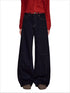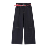 These AsGony denim pants feature a vintage-inspired brushed finish paired with a striking red belt and raw denim accent, creating a bold yet versatile retro look. Designed with a signature curved “banana” leg silhouette, they offer a loose, relaxed fit that flatters the legs while providing comfortable coverage. The long, straight-to-wide drape enhances a laid-back high-street aesthetic, making these jeans an easy statement piece for everyday styling.