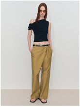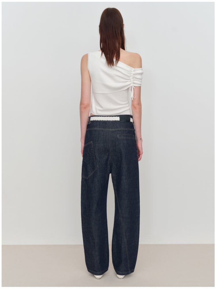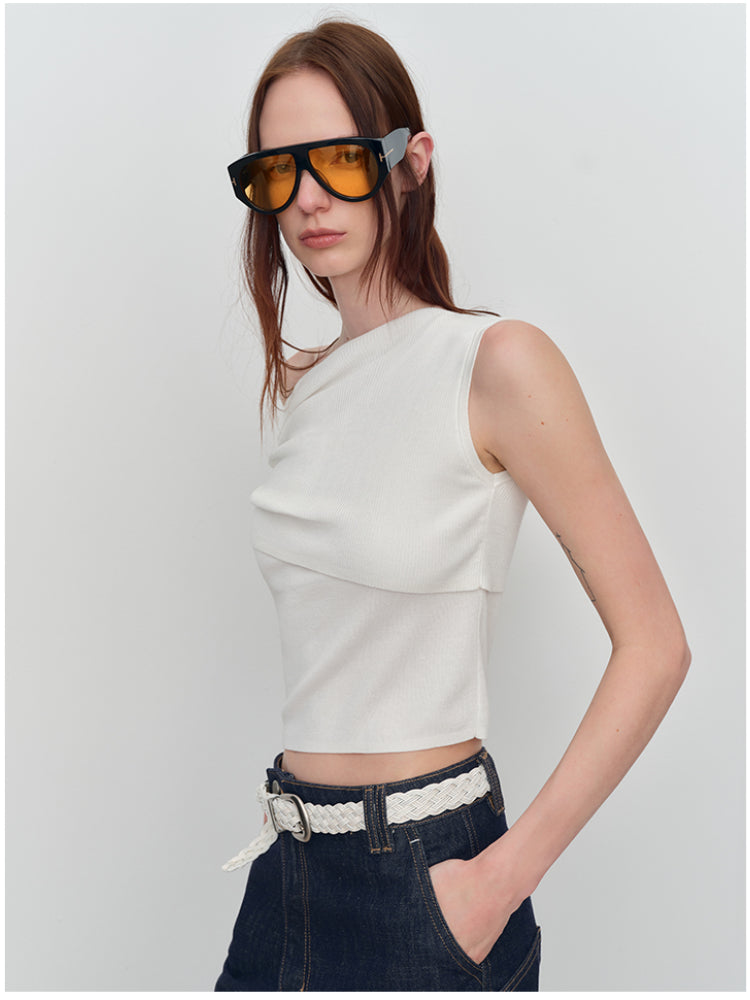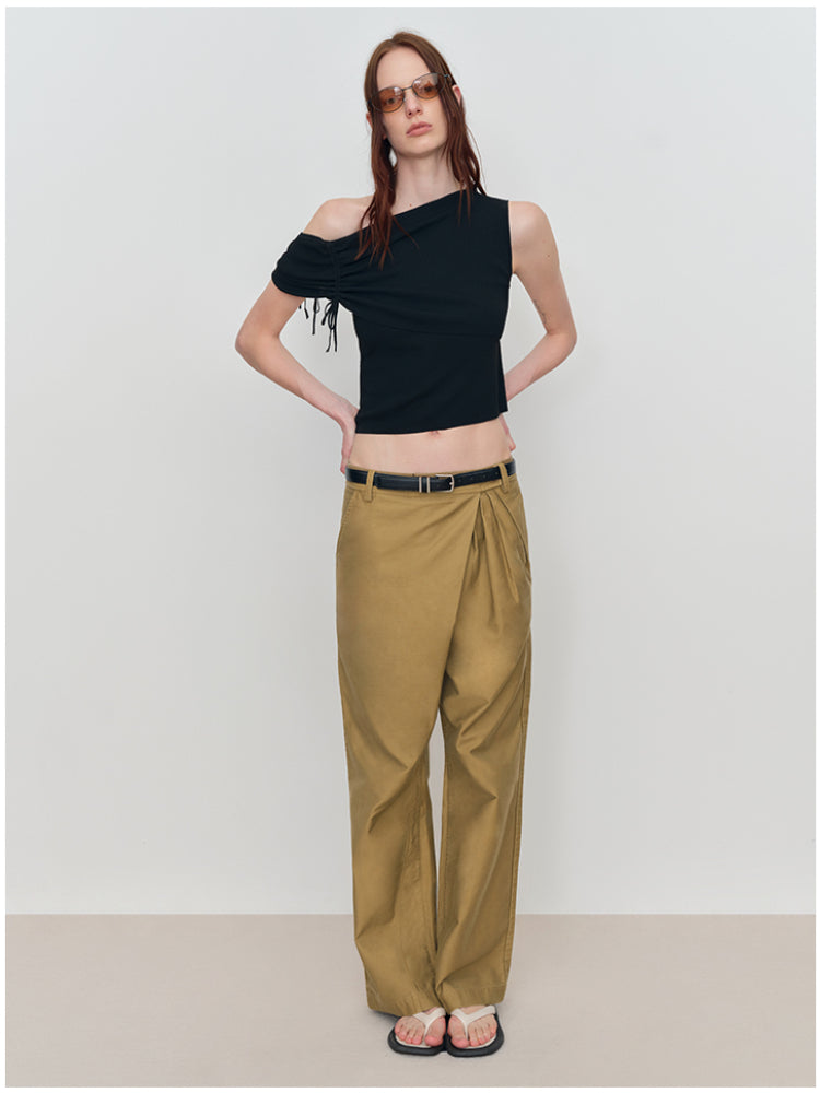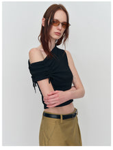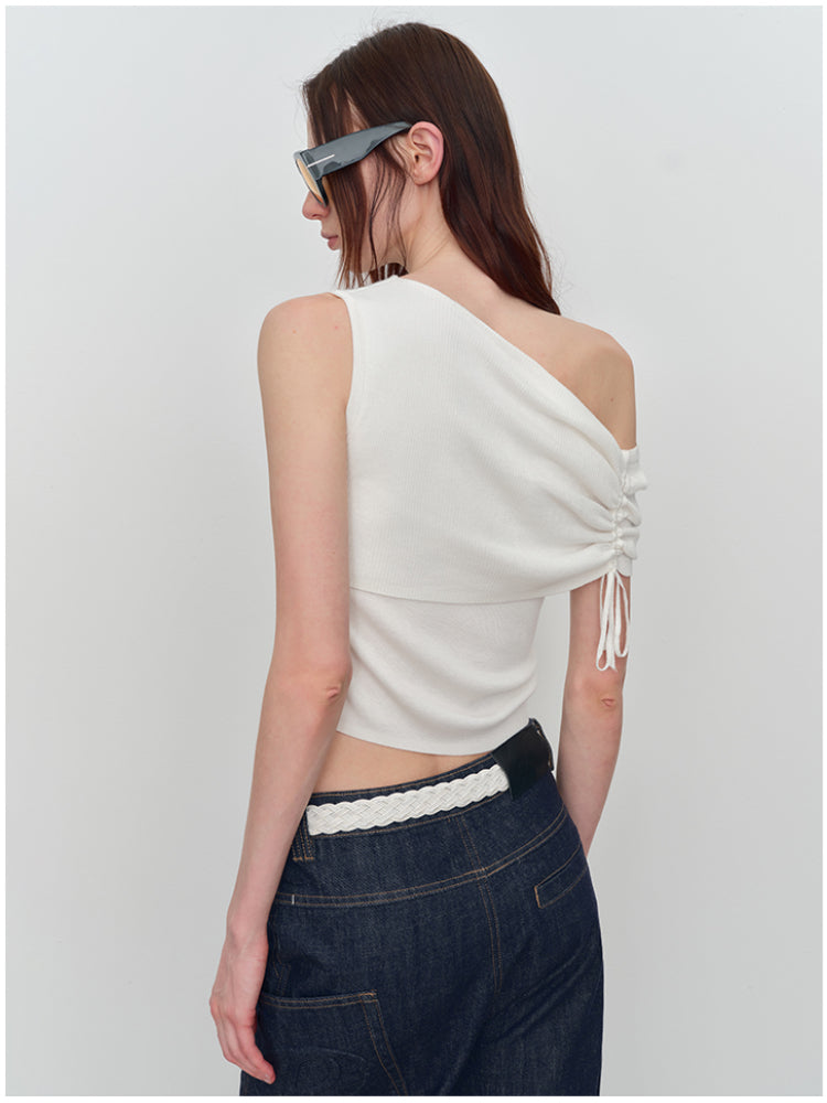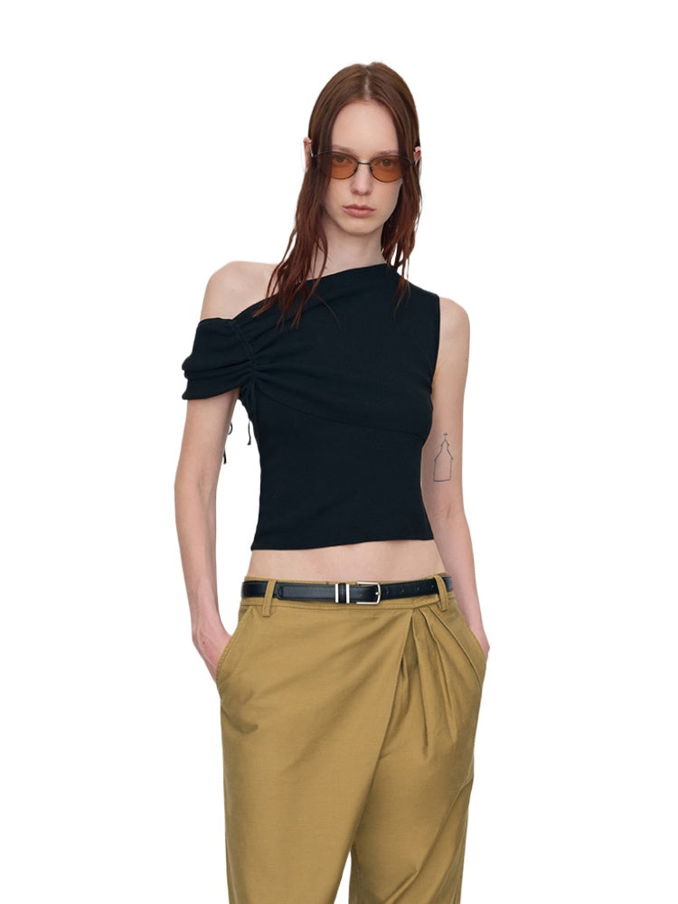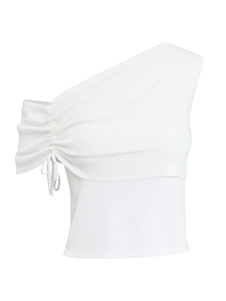 This is an asymmetric drawstring ruched one-shoulder vest. It features an asymmetric design, drawstring details, and ruched elements for a unique and stylish look.