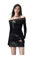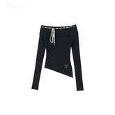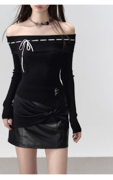 Black & Brown Off-shoulder Knitted Long Sleeve T-shirt