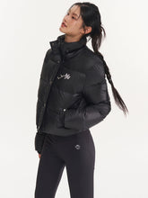 This jacket features a short design with a slightly glossy finish and a stand collar. It's filled with 90% white duck down for superior warmth, making it perfect for cold weather. The jacket includes a metal logo on the collar and logo embroidery on the chest for added style.