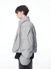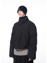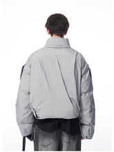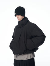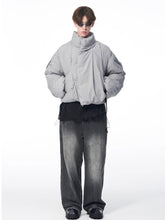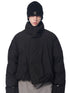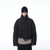 A fashion-forward cropped puffer jacket from the BLINDNOPLAN B7 collection, featuring unique pleated details and a bold printed logo design. This piece reinterprets streetwear aesthetics with a modern silhouette, combining warmth, comfort, and visual edge. The structured short cut accentuates proportion while allowing versatile styling for both casual and elevated looks.