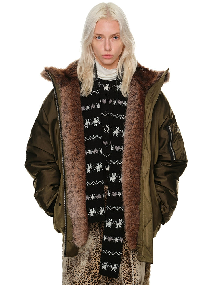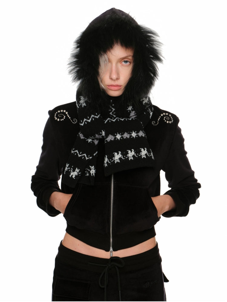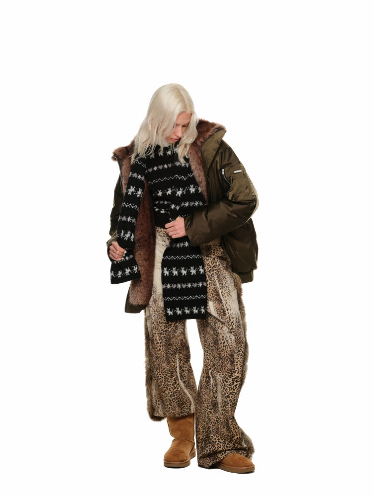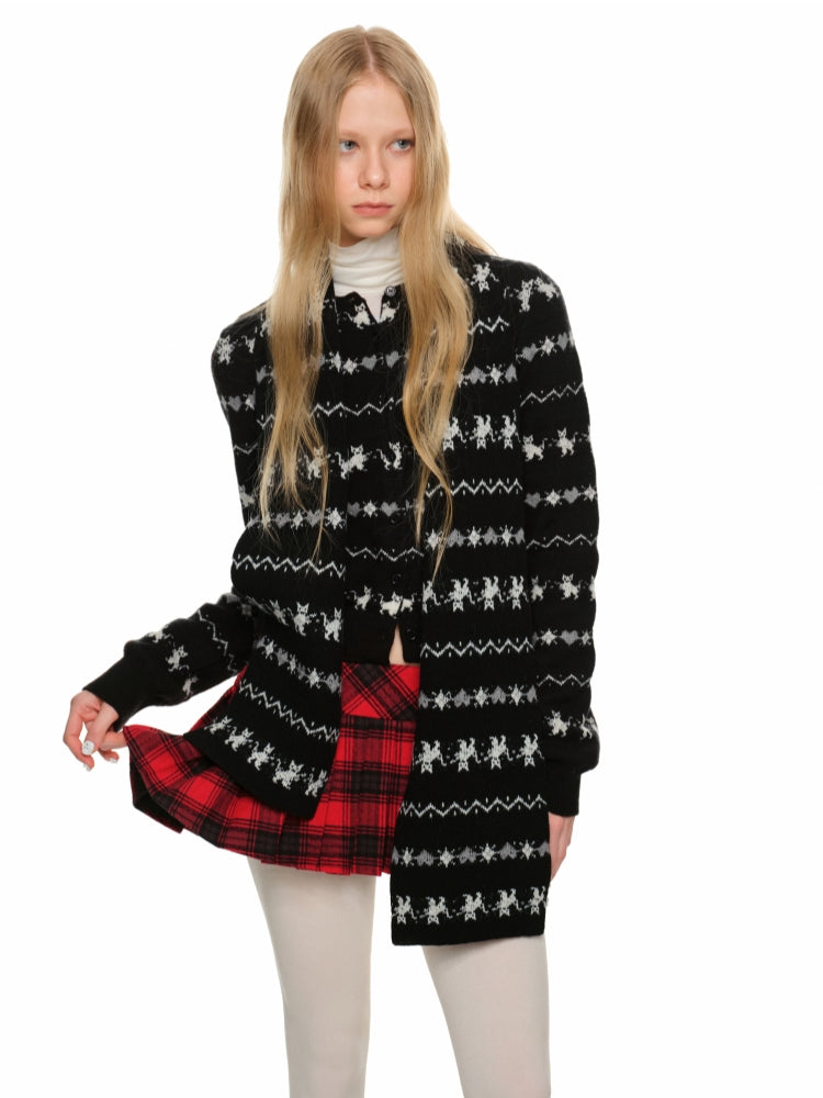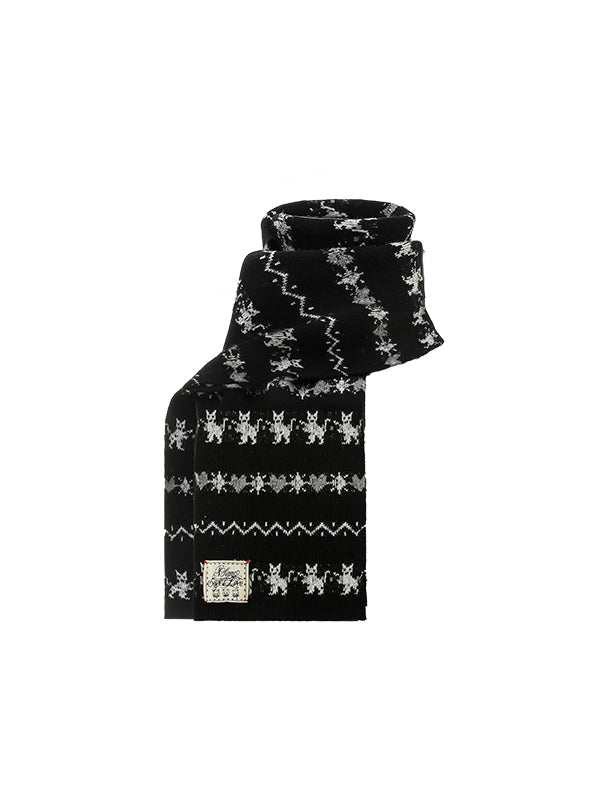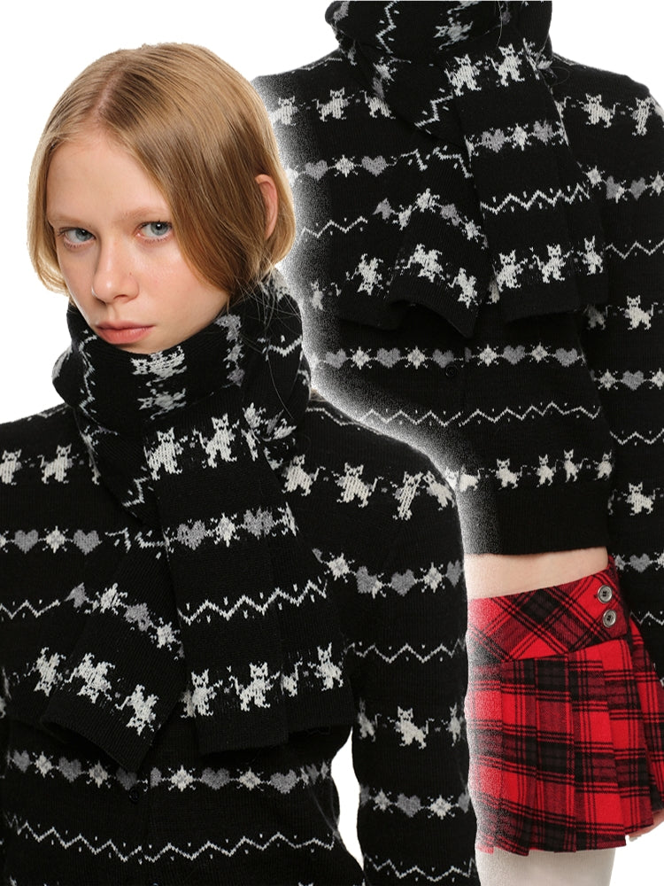 This slim-fit knit cardigan with a playful cat jacquard pattern comes paired with a matching scarf, offering both warmth and style. Available in sizes S, M, and L, this set is perfect for adding a cozy touch to your winter wardrobe.