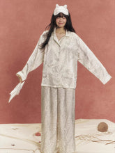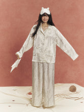 This original pajama set features a lustrous satin finish with a bold leopard print, delivering a refined yet relaxed loungewear aesthetic. Designed for comfort and style, the long-sleeve top offers a loose, easy fit, while the matching pants provide a smooth drape for all-night comfort. The set is completed with a coordinating eye mask, making it ideal for elevated home wear or gifting. Perfect for unwinding in style, it balances statement design with a soft, skin-friendly feel.