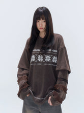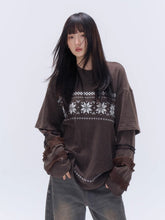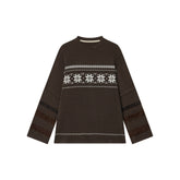 This loose-fit long-sleeve T-shirt features a Fair Isle–inspired print with a faux layered design, accented by delicate lace trim for a soft, vintage touch. Designed as an easy autumn and winter base layer, it delivers a relaxed silhouette that balances comfort with visual detail. The long sleeves and layered-look construction make it ideal for wearing alone or styling under jackets and coats.