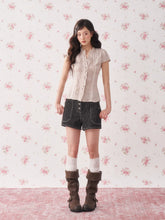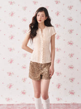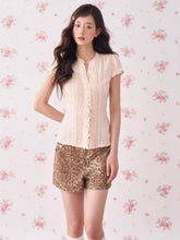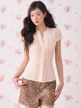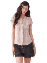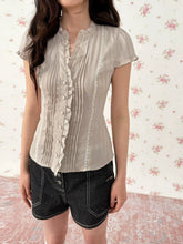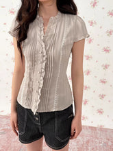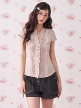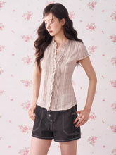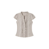 This vintage-inspired blouse features delicate lace ruffle detailing that adds a soft and feminine charm to its classic silhouette. Designed with a ruffled collar and subtle gathered accents, it creates an elegant texture while maintaining a refined everyday look. The tailored waist gently enhances the body shape, offering a flattering and slimming fit. Short sleeves provide light comfort for warm-weather wear, making it an easy piece to pair with skirts, denim, or tailored trousers for both casual and polished styling.