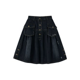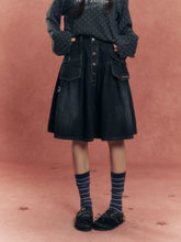 This autumn-ready denim midi skirt features a heavy vintage wash with a utilitarian workwear-inspired design. Crafted to create a slimming and versatile silhouette, it sits comfortably at the waist with a subtle A-line shape that flatters the figure. The structured denim texture combined with retro distressed detailing gives the skirt a worn-in, timeless appeal, making it an easy match for sweaters, sweatshirts, or jackets throughout the season.