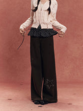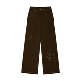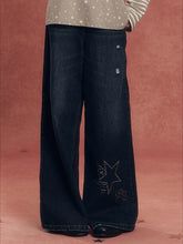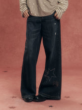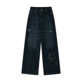 These statement denim jeans feature an original star and paw motif finished with intricate hot-fix crystal embellishments for a bold, retro-inspired look. Crafted with a vintage washed effect and subtle distressed detailing, the straight-leg silhouette is designed to visually slim the legs while offering effortless versatility. The structured yet comfortable fit makes these jeans easy to style with tops, knits, or outerwear for year-round wear.
