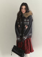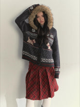This cozy knit cardigan is made from a soft, cloud-like yarn that feels smooth and gentle on the skin while maintaining warmth without bulk. Featuring a classic Fair Isle pattern in deep charcoal tones, it’s embellished with playful motifs of white snowflakes, bows, and puppies — like a pup joyfully running through freshly fallen snow. The intricate jacquard knitting creates a rich, dimensional texture, and every stitch carries a touch of handmade warmth. The symmetrical knit design enhances balance and visual comfort, while the detachable plush fur collar with horn-button closure adds a relaxed yet refined winter charm.