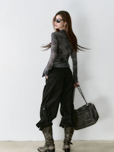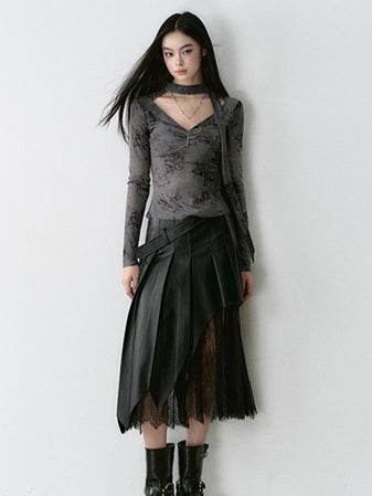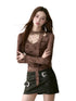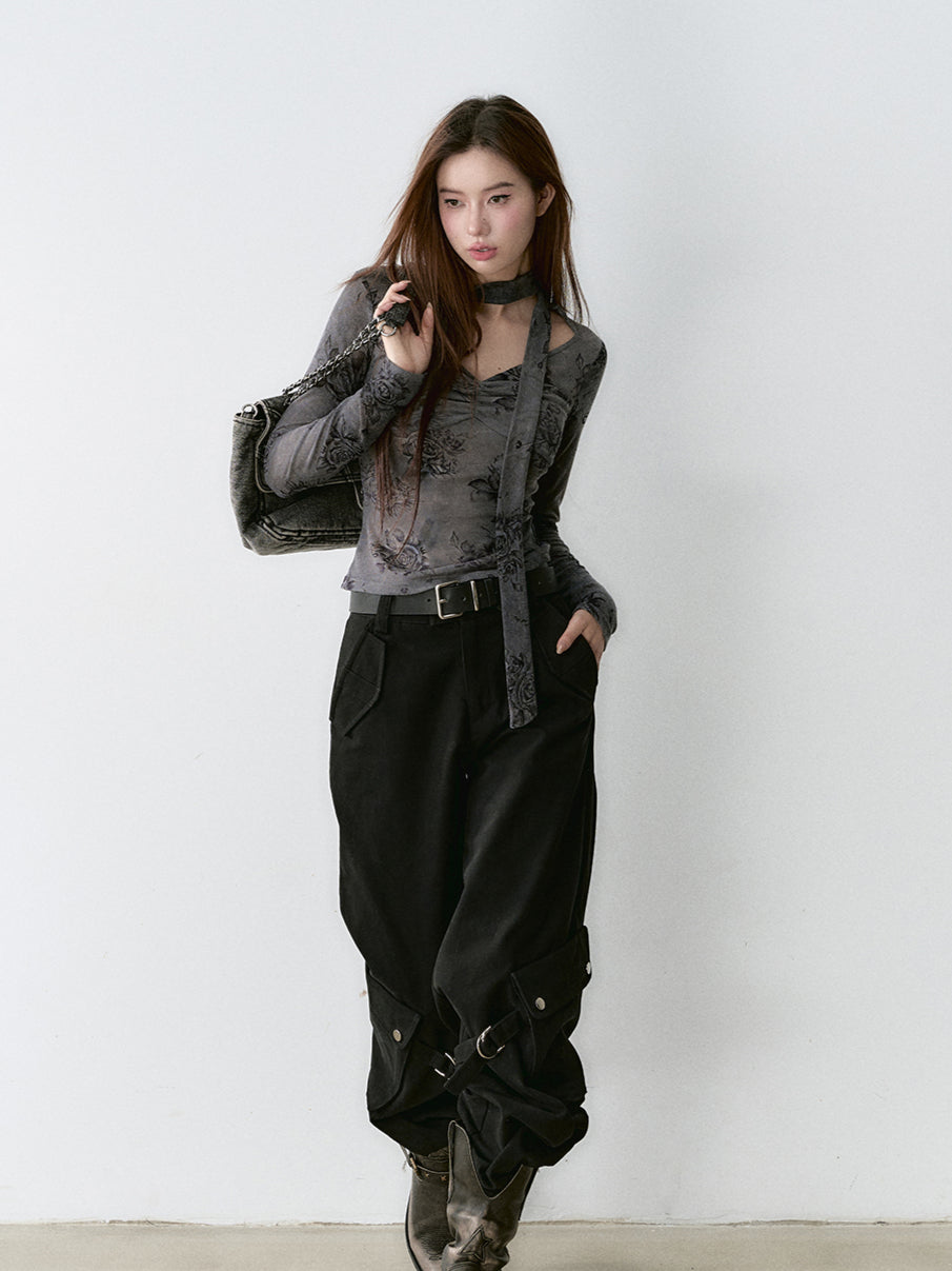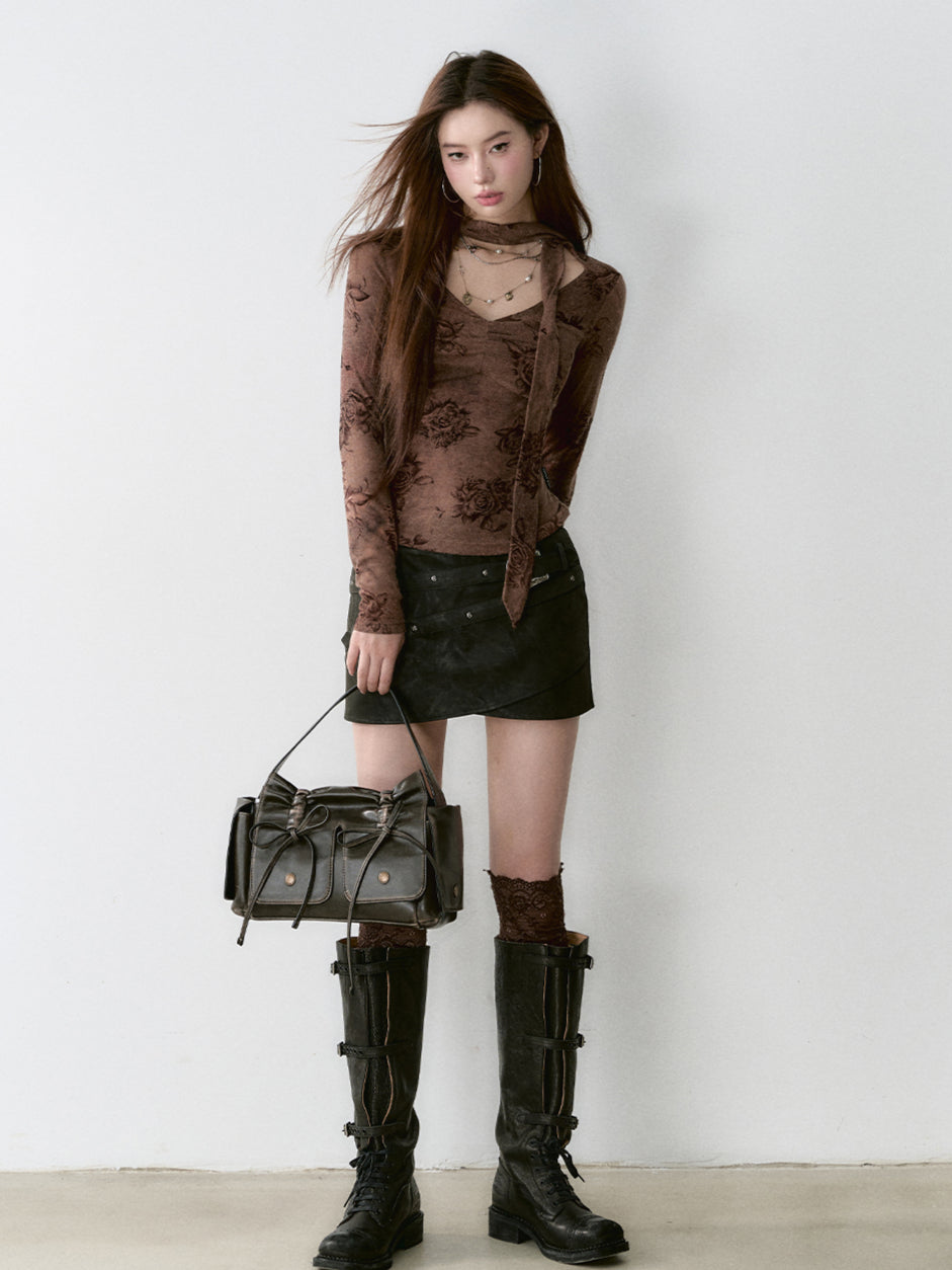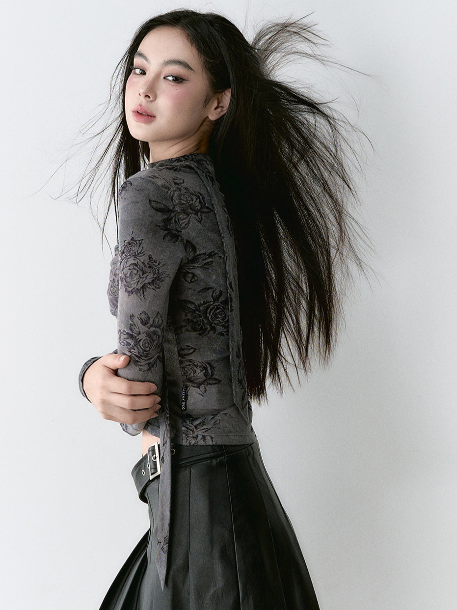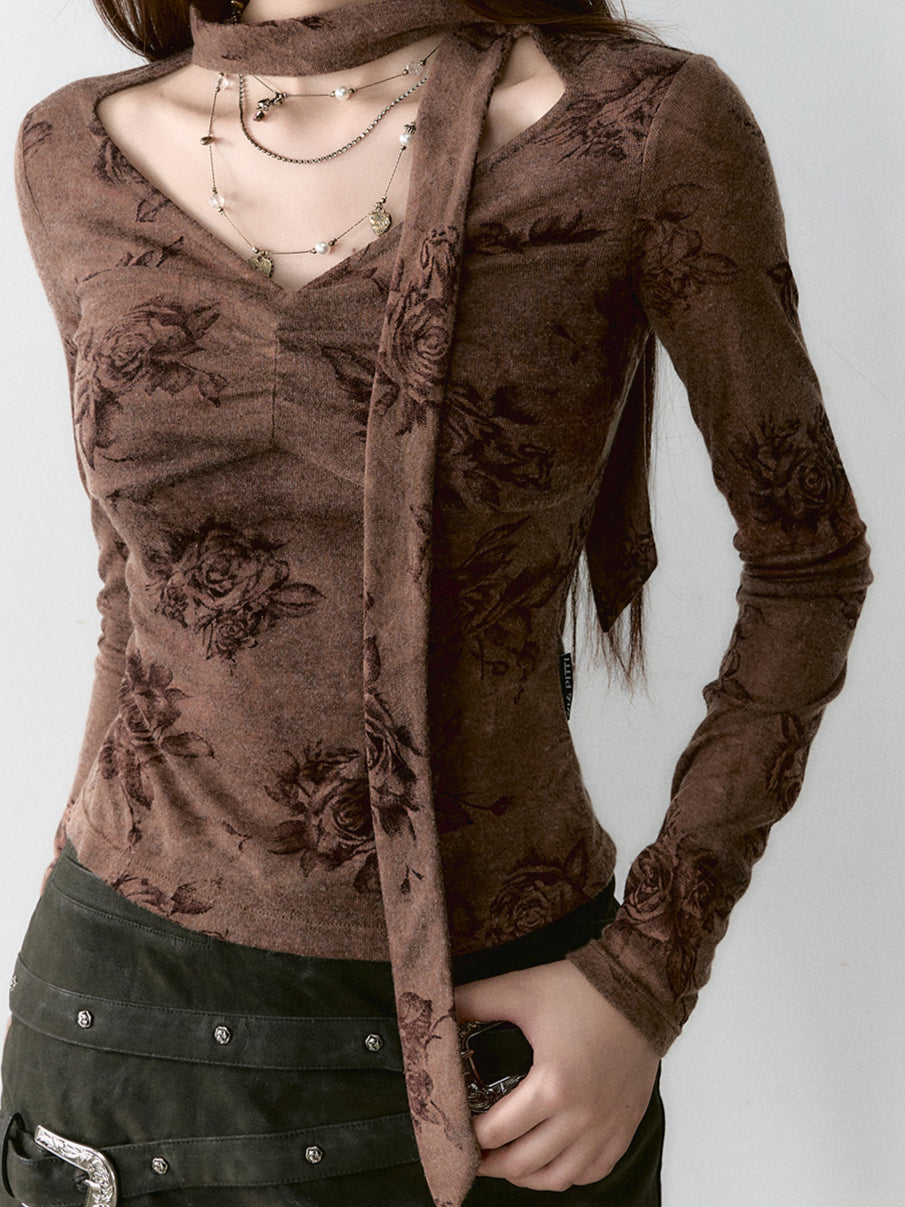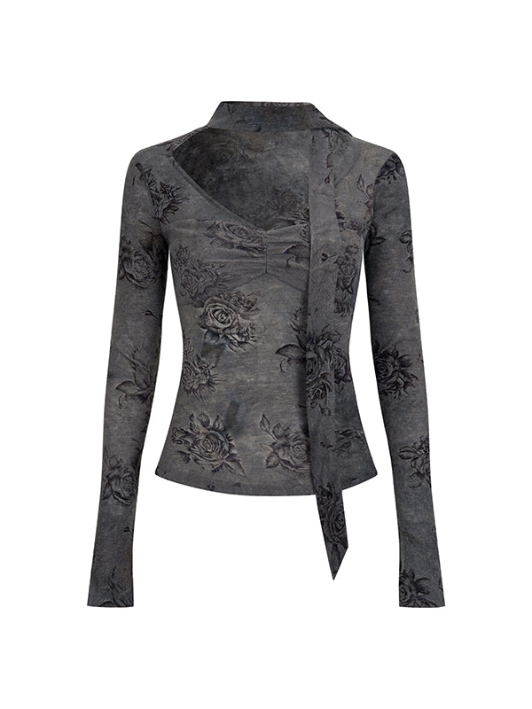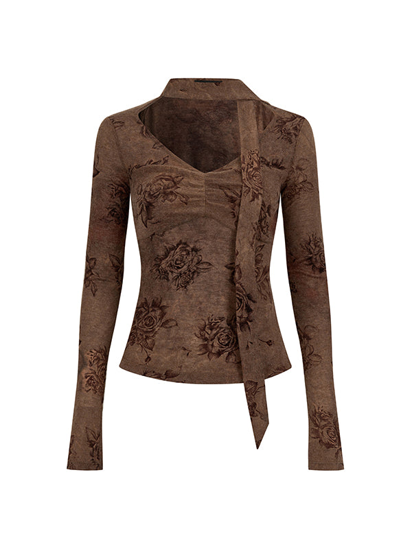 Coffee & Purple Gray Rose Print Ribbon Long Sleeve T-shirt