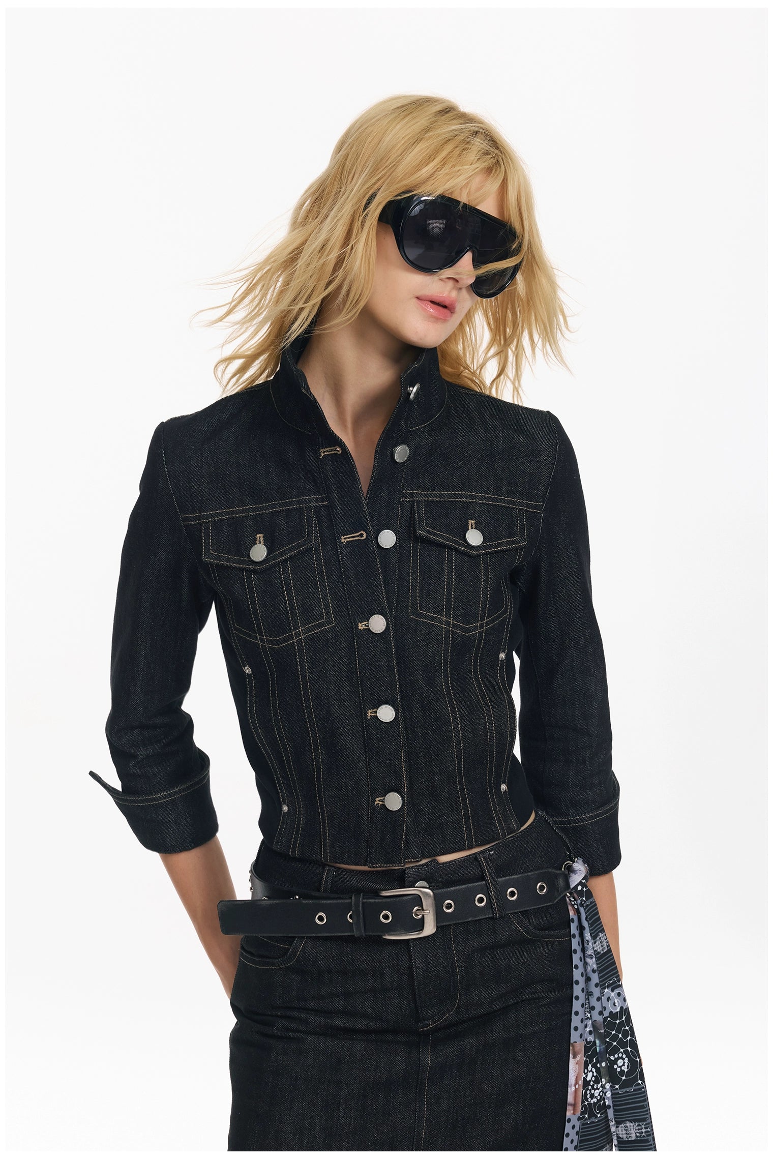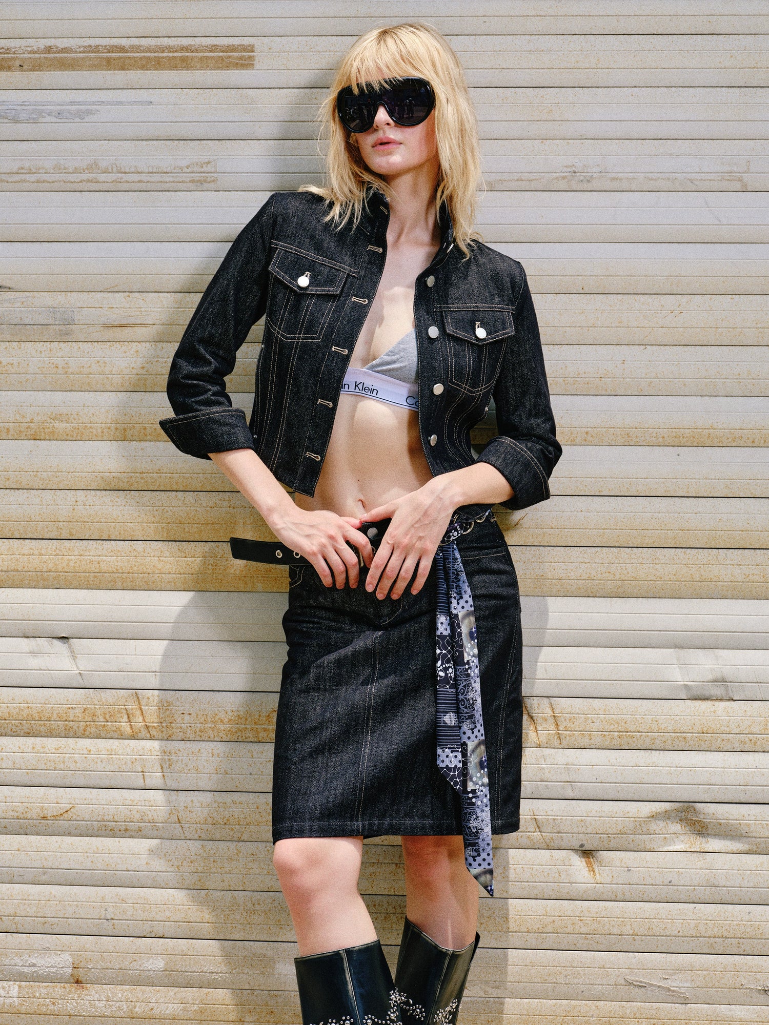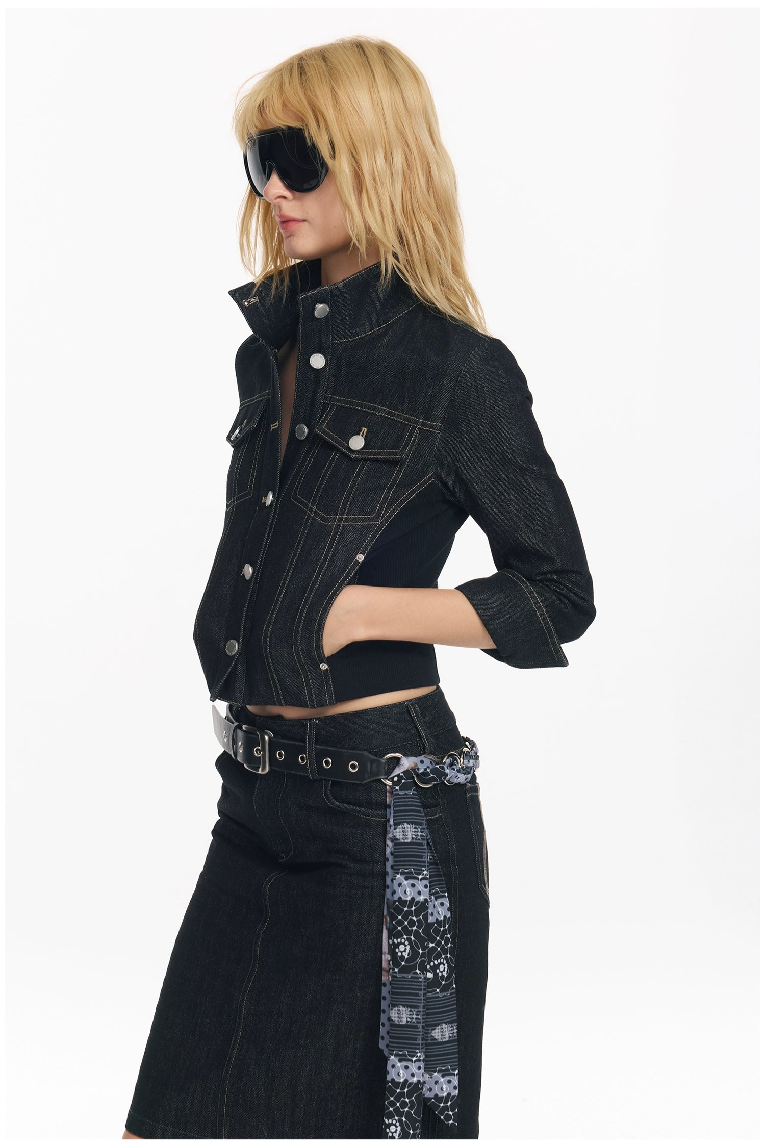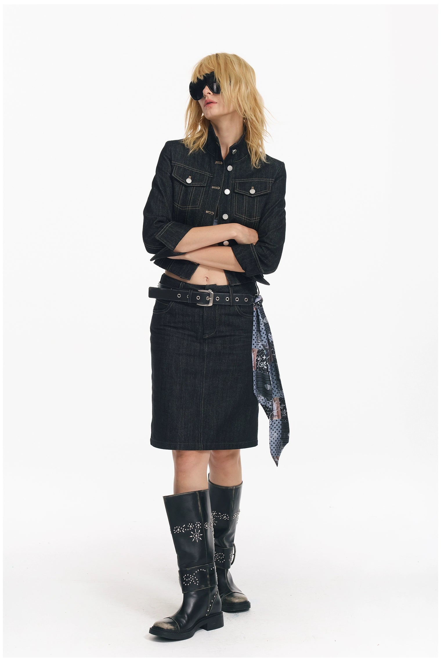 Cropped Stripe Stitch Denim Jacket & Skirt Set - CHINASQUAD