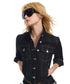 Classic structured short silhouette with three-quarter sleeves that visually elongates the body proportions. The three-dimensional ribbed stripes enhance shoulder definition. Contrasting lines deliver vintage flair. The waist is reinforced with ribbed side panels in black, improving elasticity and body coverage, making the upper body look slimmer.