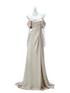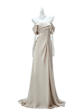 This gown is crafted from luxurious silk–acetate satin, offering a soft, luminous sheen and an elegantly fluid drape. The silhouette is defined by meticulous hand-draping and structural detailing, creating a refined, statuesque form in a delicate off-white tone. Executed through intensive artisanal craftsmanship, every element of this piece positions it far beyond standard market production.