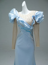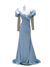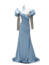 This couture gown is crafted in a serene pale-blue tone, designed with meticulous handwork that elevates its sculptural elegance. The silhouette features refined structural detailing and fluid draping that accentuates the body with a sophisticated, modern contour. As a true artisanal piece, it is produced through intensive bespoke craftsmanship, far beyond standard market manufacturing.