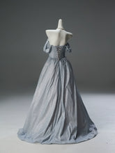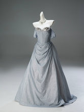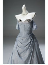 The gown, shown without crinoline, features a beautiful five-layer skirt adorned with sparkling rhinestones. The 14 fishbone boning provides superb support, sculpting an elegant shape. With its shimmering fabric and exquisite details, this gown is ideal for a grand occasion where you want to shine with sophistication and grace.