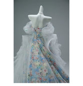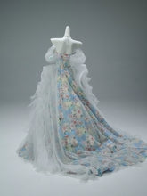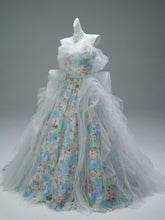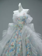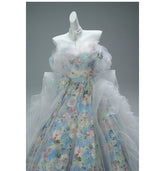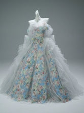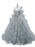 The gown, shown without crinoline, features a beautifully sculpted silhouette, enhanced by eight fishbone boning for perfect support. The seven layers of the skirt create a flawless volume, giving it an ethereal, dramatic effect. The delicate floral details and flowing design make this gown a stunning choice for any grand occasion.