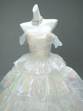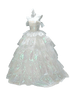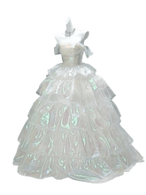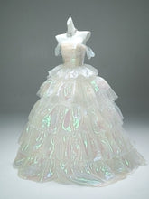 This couture gown is engineered with thirteen structured boning channels, creating an impeccably sculpted, three-dimensional silhouette that holds its form with precision. The skirt is composed of four voluminous layers, designed to achieve a full, balanced, and ethereal profile. Crafted from luminous, candy-film reflective fabric, the dress shifts beautifully under light, showcasing its artisanal texture and multidimensional sheen.