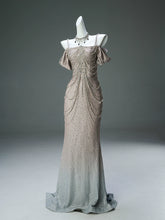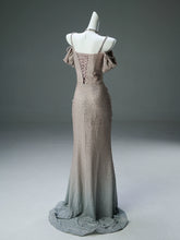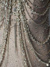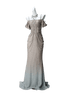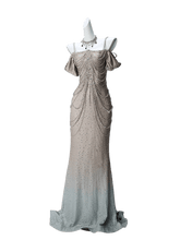 This opalescent mauve gradient gown is crafted with exceptional artisanal detail, featuring a seamless transition of color that enhances its ethereal, luminous presence. Elaborate hand-applied embellishments and sculptural draping create a refined, elongated silhouette that showcases the elegance of true couture craftsmanship. Every element—from the gradient beading to the cascading decorative chains—is executed through intensive manual work, far surpassing any market-level production.