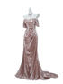 This elegant mauve-toned couture gown is engineered with nine strategically placed boning structures, offering refined support and a sculpted, form-enhancing silhouette. The lustrous, draped fabric creates a fluid, elongated line that highlights the gown’s sophisticated craftsmanship. Executed through intensive handwork, every detail reflects a level of artisanal construction far beyond standard market production.