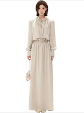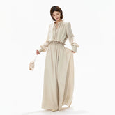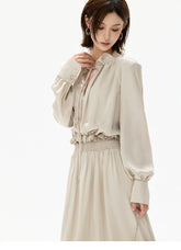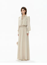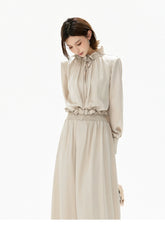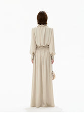 This CYNR original design satin maxi dress delivers a gentle, refined elegance with subtle eveningwear appeal. Featuring a delicate ruffled neckline, it frames the face softly while enhancing a graceful, feminine aura. The smooth satin fabric is complemented by refined ruching at the waist, naturally defining the silhouette and creating a flattering slimming effect. With its fluid drape and elongated proportions, this long dress transitions seamlessly from sophisticated daily styling to light evening occasions, offering timeless charm with understated luxury.