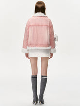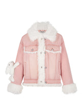 A stylish short fleece-lined denim jacket featuring plush accents and adorable bear details. This jacket offers a cozy, playful design, perfect for staying warm and fashionable during the autumn and winter seasons.