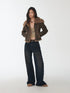 A refined faux shearling-lined jacket blending classic leisure with a flattering silhouette. The design features a large lapel collar that accentuates the neckline and shoulder proportions, multi-panel structure for a tailored fit, and adjustable buckle details at the hem for added dimension and modern attitude. Crafted from premium washed cracked-texture eco leather, the surface has a vintage grain feel that pairs with a soft faux-wool inner layer for warmth and comfort. Metallic zip pockets complete the look, giving this piece a structured yet cozy style.