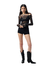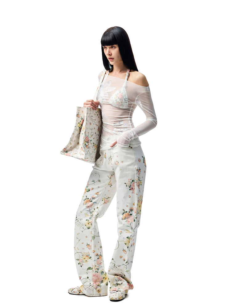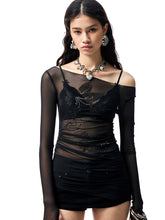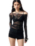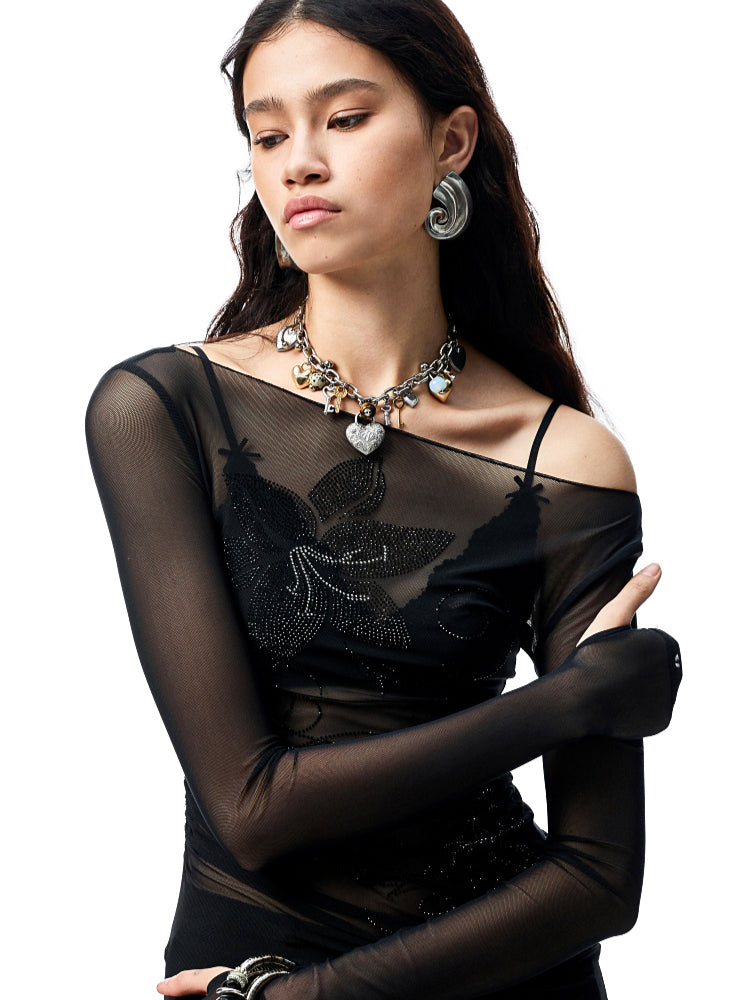 A vacation-vibe floral rhinestone semi-sheer cover-up. The medium-length slim-fit silhouette is suitable for both single wear and layering, effortlessly contouring the body. The long-sleeve off-the-shoulder design allows for free adjustment of the shoulder-sleeve shape, exuding a cool and spicy charm. The single-side waist-joint ruched design is more slimming and helps hide imperfections.