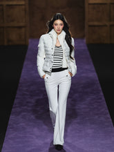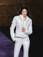 A sleek, short-length down jacket designed with a slim, waist-accentuating silhouette and a modern mock-neck collar. This lightweight style features a layered two-in-one visual effect, combining elegance with practicality. Made with soft, wind-resistant fabric and premium down insulation, it delivers warmth without bulk — perfect for transitional autumn and winter weather. A refined balance of urban style and functionality.