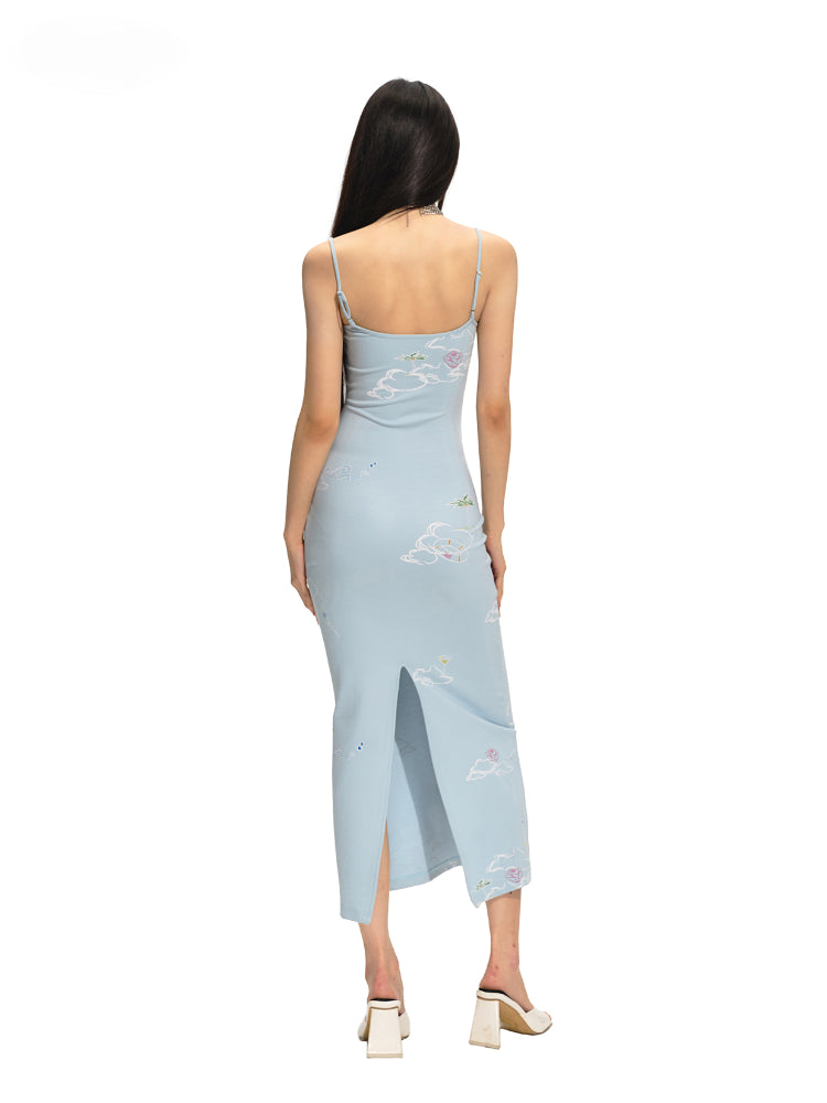 The slim, straight-cut design with a U-neckline and side coverage hides side breasts, increasing skin exposure at the front and back while accentuating the shoulder and neck lines. The back slit ensures comfort and ease of movement, while slimming the legs.