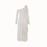 Soft, elegant, and irresistibly feminine — the “Hot Milk” dress embodies understated sophistication in a creamy knit texture. Designed with an off-shoulder neckline that highlights the collarbone, it gracefully contours the body with a smooth, elastic fit. The long, flowing silhouette enhances movement while maintaining a cozy yet refined aesthetic, perfect for effortless day-to-evening transitions.