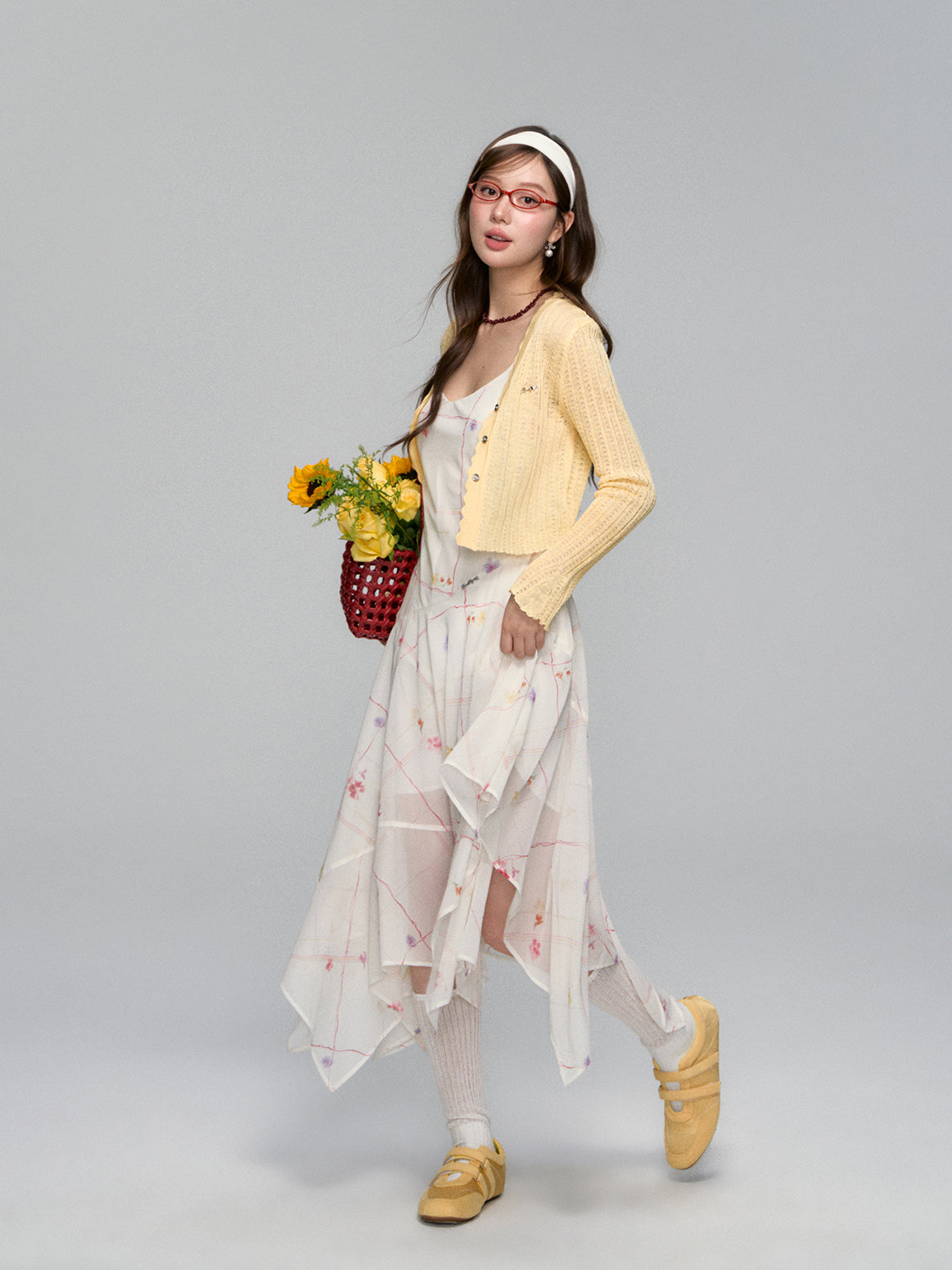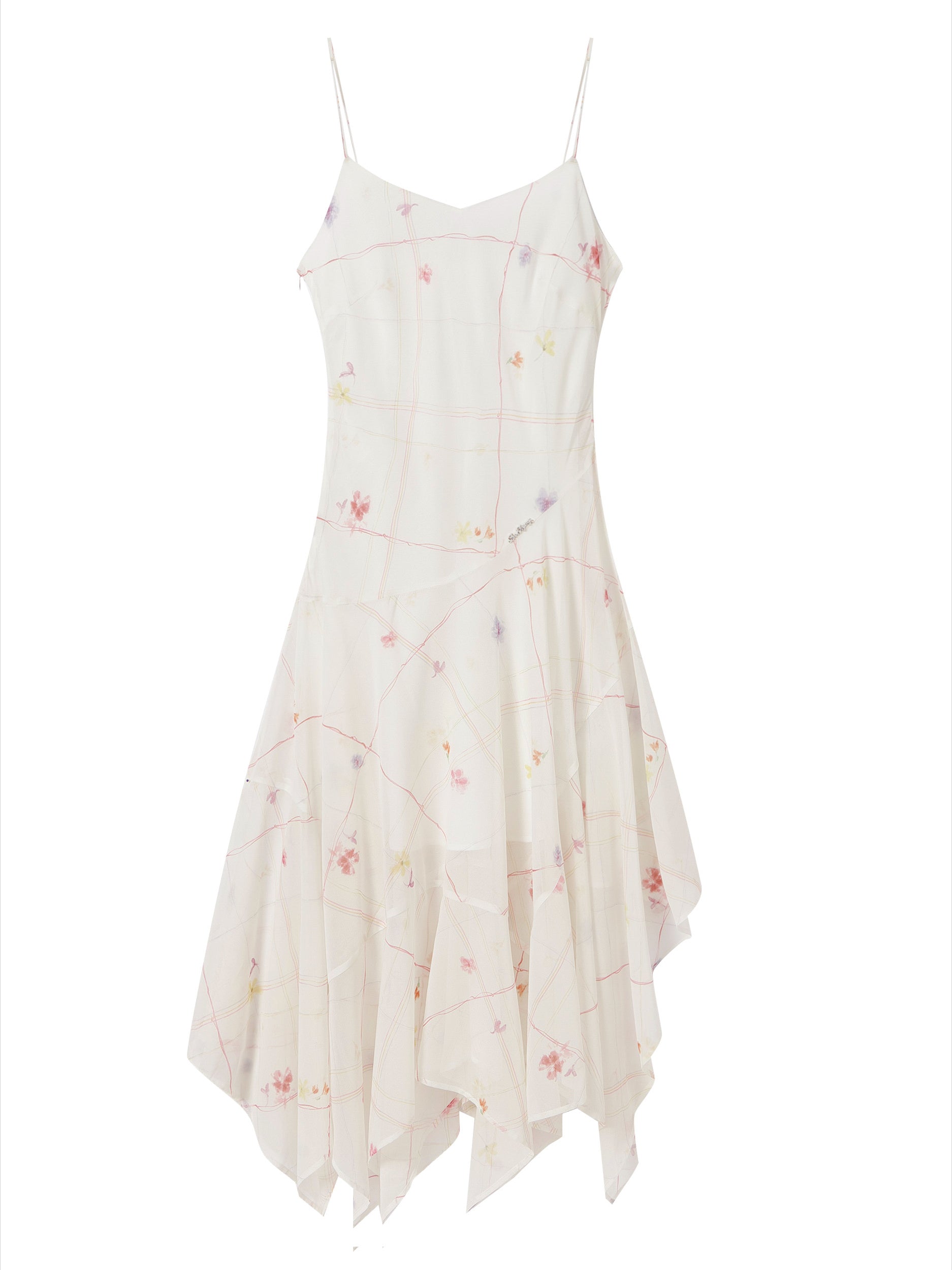 Crafted from premium chiffon, this mid-length dress flows beautifully with a lightweight and silky touch. The asymmetrical layered hem elongates the figure, while the abstract floral print and irregular design add sophistication. Adjustable shoulder straps offer flexibility for personalized wear. Perfect for vacations or casual elegance.