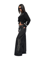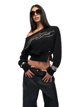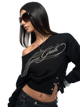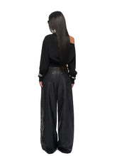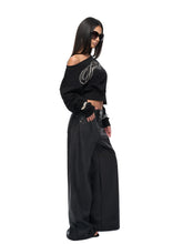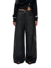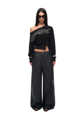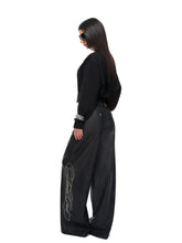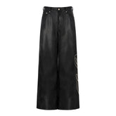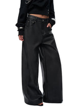 This two-piece set features an asymmetric, relaxed-fit crop sweatshirt accented with silver thread logo embroidery and subtle rhinestone embellishments. The left side of the hem includes a four-button adjustment for a customizable cinched waist effect. The matching pants come in a low-rise, wide-leg silhouette with large-scale silver thread logo embroidery on one side. Rivet details enhance the pocket edges, while the faux-leather texture is moderately thick and pleasantly soft for comfortable daily wear.
