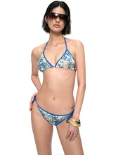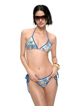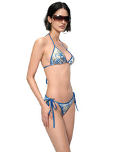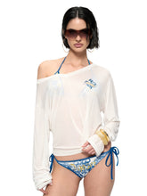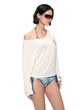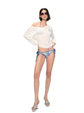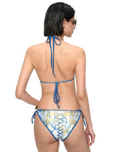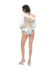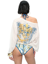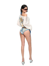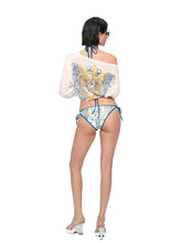 A lightweight, airy two-piece swim set crafted from ultra-soft, high-stretch Tencel Lyocell fabric for a cool, breathable feel. The relaxed-fit cover-up features a draped/crew-neck hybrid design for versatile styling, enhanced with digital printing and anti-sublimation gold-foil detailing for a luxurious finish. The matching printed bikini comes with removable padding and a blue-gold contrast palette. The triangle top and tie-strap design allow fully adjustable shaping to suit different body types. A refined, heavy-craftsmanship swim look that merges comfort, shine, and artistic printwork.