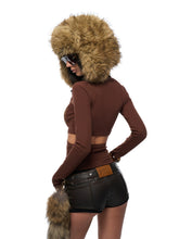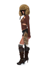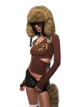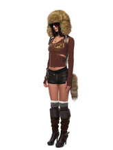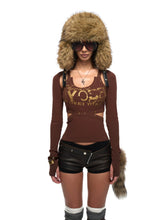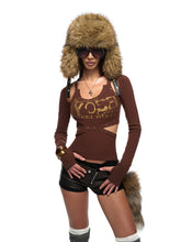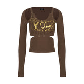 This slim-fit knit top features a U-shaped neckline combined with raglan-style cutout sleeves, creating a sculpted and modern silhouette. The chest is embellished with an original metallic logo print, adding a refined visual highlight. A hollow-out design extends from the waist to the back, enhancing dimension and allure. The neckline and waist are detailed with circular antiqued brass rivet trims, giving the piece a distinctive, edgy yet polished character—ideal for layered styling or wearing alone as a statement top.