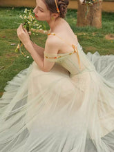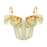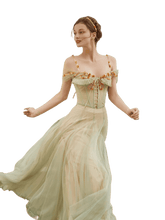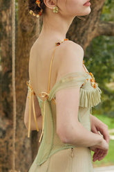This French fairy–inspired collectible two-piece set features a delicately structured corset-style bustier paired with a flowing tulle midi skirt. Designed with refined fishbone construction, the fitted top beautifully defines the waist and upper body, while the layered sheer skirt adds softness, volume, and an ethereal finish. The fresh green tone evokes a magical woodland mood, making this set ideal for special occasions, photoshoots, garden parties, and high-end styling. Worn together or separately, it embodies couture-level craftsmanship with romantic fantasy charm.