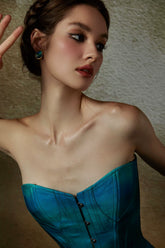 This refined two-piece set is inspired by classic theatrical costume aesthetics, reimagined through a romantic French design lens. The corset-style top features structured fishbone construction with adjustable drawstring detailing, allowing for a customizable and sculpted fit. Finished in a luminous mother-of-pearl satin tone, it highlights the neckline and waist with elegant precision. Paired with a high-waist satin mermaid skirt, the silhouette flows smoothly over the hips and flares subtly at the hem, creating a graceful and dramatic profile. Ideal for special occasions, evening events, or statement styling, this set blends historical romance with modern femininity.